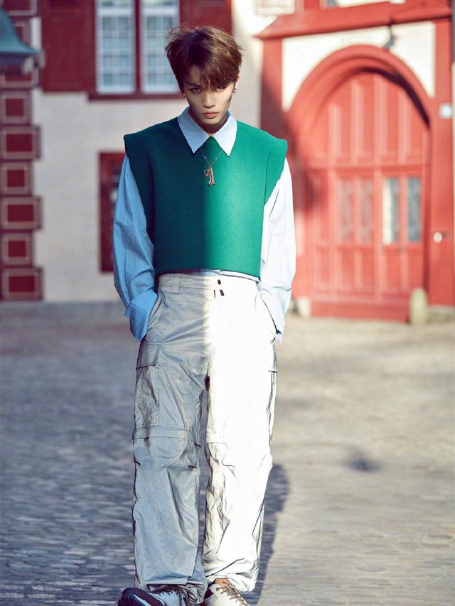 而同样是叠穿式的造型,林彦俊绿色针织背心内搭上蓝色衬衫的造型则更显贵族气质,为整个造型平添了一丝高级感来,胸前搭配一款毛衣链, 更显精致和大气。