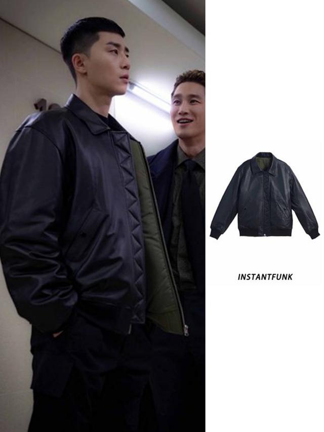 黑色的皮衣外套更是酷到没边啦,而且很有大佬的气场,配上朴世路严肃的表情,一个字:帅!这件外套是INSTANTFUNK旗下的产品,是高俊熙的造型师金智慧创立的休闲男女同款品牌。INSTANTFUNK是INNSTANT和FUNK的合成词,是以经典为基础,再加上当代的时尚潮流,以及仅属于INSTANTFUNK的独特品牌。
